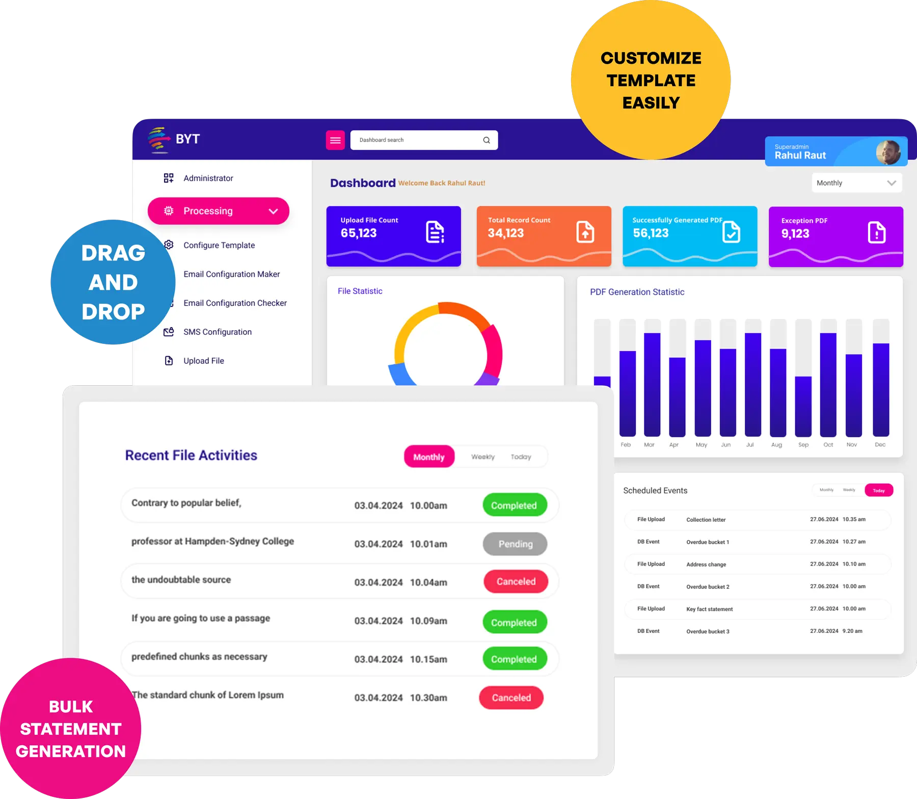 A high-performance statement creation solution enabling financial service providers to design custom templates with drag-and-drop ease. Ideal for the B&FS sector, it empowers banks and financial institutions to swiftly generate bulk statements and deliver e-statements efficiently.